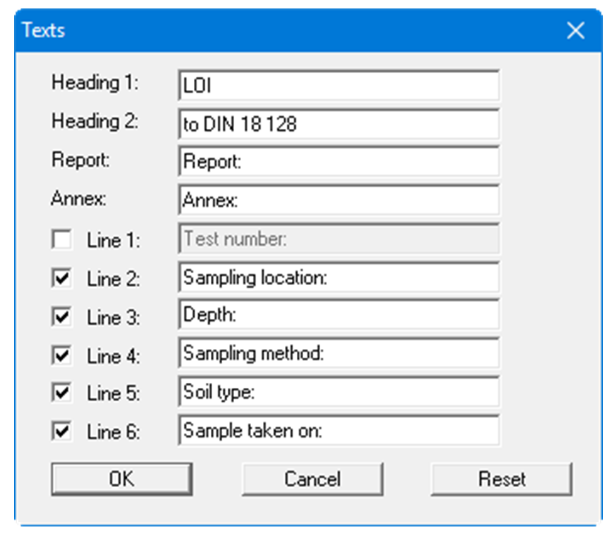 Your input in rows 1 to 6 of the above dialog box, as well as the input for "Report:" and "Annex:" also represent the designations for the input boxes in the "Edit/General" menu item dialog box. If lines are deactivated in the above dialog box, the corresponding input boxes in the "Edit/General" menu item dialog box are also deactivated.