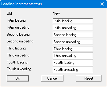 The "Reset" button resets the labelling of the loading increments to the defaults. If you have retroactively changed the language to English you will see the internal program translations