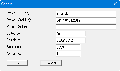 After selecting this menu item you can enter general data such as project designation, report number, annex number etc.
