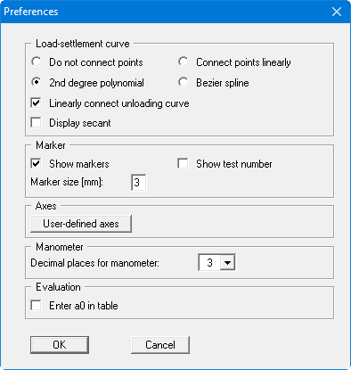 According to DIN 18 134, a 2nd degree polynomial using compensation according to the least squares method is required for analysis of the plate loading test. This method is utilised in all cases to determine the governing plate loading values, completely independently of the smoothing out procedure selected here. However, representation of the plate loading test using the "2nd degree polynomial" switch sometimes leads to rather unusual curves. Alternatively, then, and for optical effect only, you can select between the methods "Connect points linearly" or "Bezier spline" for the representation.