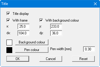 The position of the element on the output sheet and its size can be defined or edited by means of the variables "x" and "y", "dx" and "dy". The element can be provided with a frame and a background colour to suit your personal requirements. If the element needs to be returned to its original condition, this can be done using the "Reset" button. Alternatively, you can alter the size and shape of the element using the mouse (see menu item "Output preferences/Move objects").