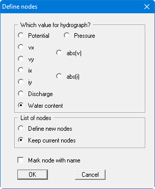 If you want to evaluate flow variables as hydrographs for further nodes, click the "Keep current nodes" option button before closing the dialog box. After clicking "Define new nodes" the existing nodes are deleted from the list.