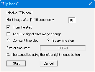 This is one of the program's most impressive types of evaluation. One of the menu items for contour line or velocities visualisation from the "Evaluation" menu must have been already started. Then go to this menu item to open the following dialog box: