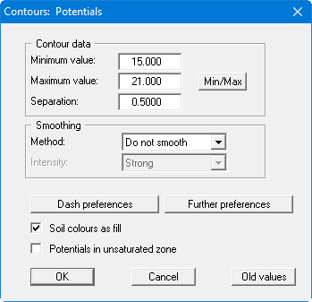 You can specify the type of visualisation for the contour lines by means of the "Dash preferences" and "Further preferences" buttons. By activating the appropriate check box the soil colour can be used as fill.