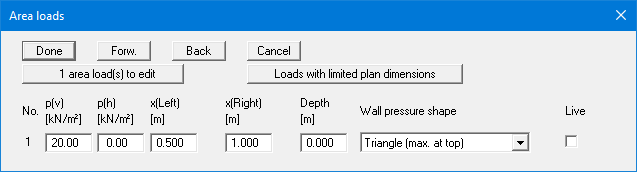 The "x area load(s) to edit" button allows you to determine the number of area loads to be considered. Subsequently you can enter the sizes "p(v)" (= vertical) and "p(h)" (= horizontal), the ordinates and the "Depth" of the area loads. You must also enter the "Wall pressure shape" of the resultant horizontal forces on the wall (see also "Theoretical principles: Area loads"). To define an area load as a live load, activate the corresponding “Live” check box on the right.