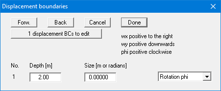 In the example above a "Rotation phi" of the wall of 0.0 has been entered 2.0 m below the top of the wall. The "Displ. wx" and "Displ. wy" in the pull-down menu stand for the horizontal and vertical displacements; the direction is defined by means of the sign.