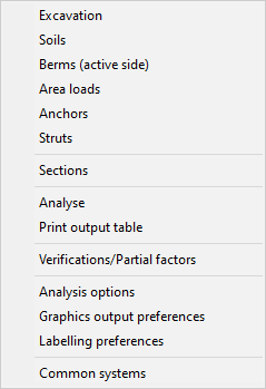 You can quickly design various new systems using the "Common systems" menu. Without having to work through the various menu items one after the other, you can enter the essential elements such as excavation geometry, groundwater, anchors, soil properties, etc. in just one dialog box (see menu item “Editor 1/Common systems”).