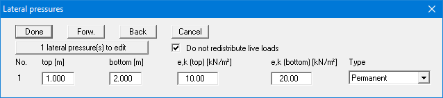 The number of lateral pressures can be modified using the "x lateral pressure(s) to edit" button. Then enter the ordinates in metres from the top of the wall or as absolute heights, and the values for the lateral pressures.