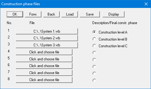 After clicking one of the "Click and choose file" buttons, the desired file can be selected. The button is then labelled with the file name. The project identification is shown after this (in the example above "Construction level A", "Construction level B", "Construction level C"). If you need to remove a file from the list, click on the button with the file name and select the "Cancel" button from the file selector box. The file sequence should correspond to the construction phase sequence. The radio button behind the file name serves to indicate up to which file the summary should be displayed.