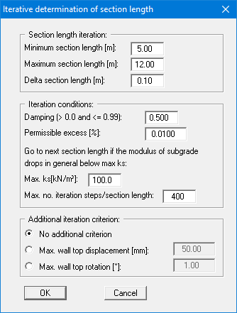 Enter the maximum and minimum section lengths, as well as a delta section length, in the top group box of the dialog box shown above. This defines the range of lengths from which the optimum length should be selected. The central group box deals with iteration (see explanations in “Theoretical principles: Bedded systems - Variant “Section length fixed and bedded toe””). In the bottom group box, you can define additional iteration criteria, such as maximum displacement of the wall top.