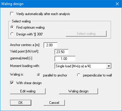 Using this menu item, you can specify preferences and then carry out the design for an analysed system by means of the "Waling design" button. The bending and shear verifications of the waling are then displayed on the screen.