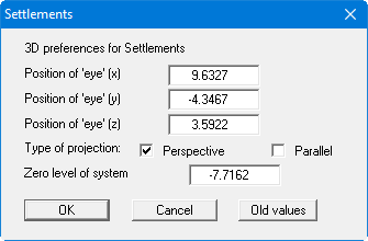 Here, select the point of observation (position of the eye in x, y and z coordinates), the type of projection and the zero level of the 3D presentation. The settlements are displayed above and below the zero level (z ordinate) in three dimensions. The program will generally make sensible suggestions for the input values in the dialog box, so you will not normally need to make alterations.