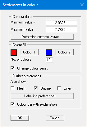 The "Determine extreme values" button computes the minimum and maximum settlements and enters them into the appropriate input boxes. However, you need not retain these values, but can also define your own. No smoothing of the contour lines can be performed here."Colour fill" group box