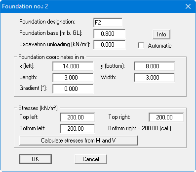 After the foundation designation you enter the depth of the foundation base (FB), the excavation unloading, the foundation dimensions and the corner stresses. For linear stress distribution, input of three stress values is sufficient. The fourth value then results automatically. If foundations are already defined, you can also reach this dialog box by double-clicking in the foundation surround on the screen.