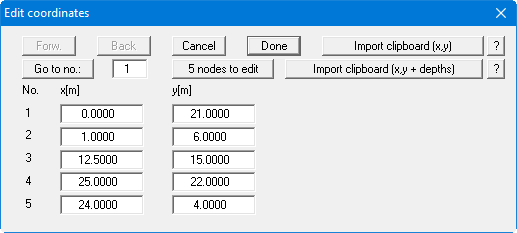 The data for the example system based on Table 1 (coordinates of drilling points) are entered in the above dialog box. After entering the data go to the menu item "Page size + margins/Auto-resize" or alternatively [F9] in order to achieve a screen-filling visualisation of the constrained modulus profiles. If you already have the coordinates and/or layer depths available in a text editor or in Excel, they can be imported from the Windows clipboard using the two corresponding buttons. Information on this is provided via the two "?" buttons. By pressing the lower button, "Import clipboard (x,y + depths)", the program anticipates 2 columns for x and y and then as many columns as you have defined soil strata.
