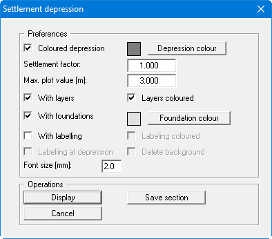 Activating the "With labelling" check box automatic section labelling can be used. When activated the program inserts a table below the section, containing the calculated settlements at the settlement points defined. The labelling font size can be altered to suit requirements. If the "Labelling coloured" check box is activated the settlements are visualised in the above defined colour for the depression. If the "Labelling at depression" check box is activated, the automatic labelling table is no longer shown and the settlements entered in the graphics directly at the settlement points.