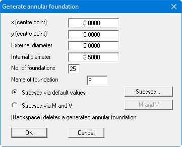 You need only additionally enter the interior diameter. Optimum annular foundations can be generated with triangular foundations, as adjustment to the foundation geometry is much better using triangles (see "Triangular foundations/Generate foundations" menu item).