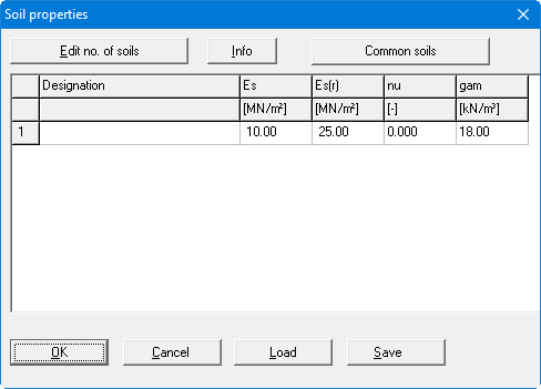 In the above dialog you can enter the name, the constrained modulus for initial loading and for reloading, Poisson's ratio and the unit weights of the individual soil layers. Using the "Common soils" button, you can easily select the soil properties of many common soils from a database or determine intermediate values. In the dialog box, which you open by pressing the "Common soils" button, open the "Soils_english.gng_ggu" file when first starting the program in English ("Edit table"/"Load" buttons). Then save the data set in the "Soils.gng_ggu" file on the program level to open your modified database file when the program starts. You can also enter your own data ("Edit table"/"x soils to edit" button) and save it in the "Soils.gng_ggu" file. You can also use your adapted file in other GGU programs by means of the "Common soils" function if you copy the file into the appropriate GGU program folder.