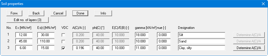 Define the soil layer improved by vibrodisplacement compaction by activating the "VDC" check box. Enter the corresponding parameters for this layer (see "Info" button). The ratio of the areas "A(C)/A" can be determined and adopted in the table by pressing the far right button. The ratio "E(C)/E(B)" should not be greater than 15 to a maximum of 20.