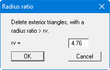 The radius ratio describes the relationship between external radius and internal radius of a triangle. For an equilateral triangle, this ratio equals 2.0 (optimum). Before you arrive at the dialog box above you will be shown the maximum and minimum radius ratios. In the example above, all external triangles with a radius ratio greater than 6 will be removed. To avoid chaos, only exterior triangles will be removed.