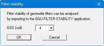 With regard to examining the filter stability of geotextile filters to Fact Sheet DWA-M 511 use this menu item to determine the necessary soil properties (grain size at d50 and uniformity coefficient Cu) from the grading curve of the relevant soil, which is selected in a dialog box if several grain size distributions are present.