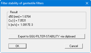 The data can be copied to the Windows clipboard in the usual way using the button "Export to GGU-FILTER-STABILITY via clipboard". If no additional grading curves need to be examined, exit the dialog box by clicking the "Cancel" button.