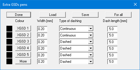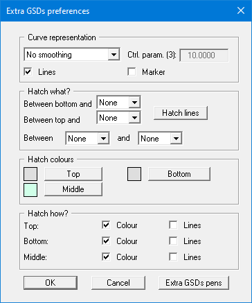 You can use the "Extra GSDs pens" button at the bottom of the dialog box to set different pen colours, widths and, if required, dashing for the display of the first 5 extra grain size distributions (see figure below).