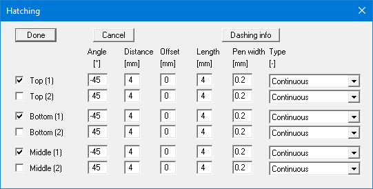 Hatching can consist of two lines, e.g. in order to create a cross-hatch. The curves for the required ranges are activated using the check boxes. Further information is available by pressing the "Dashing info".