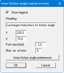 Using this menu item you can define a legend for the surcharges and reductions for the inner friction angle, if you have activated the "Show legend" check box. The legend can only be displayed if automatic estimation of the friction angle is activated in "Edit texts and allocations", one row below "Enter what?" in the menu item "Output preferences/Texts + table".
