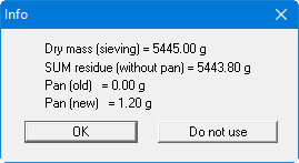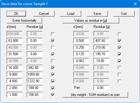 After adapting the sieve diameters, the sieve residues for the individual sieves are entered corresponding to the test data. Press the "(dry weight - SUM residues) as pan" button to calculate the pan residue. The following box is displayed:
