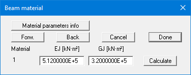 Due to the fractured tension zone often only a fraction of the theoretical torsional stiffness GJ (often even = 0.0) is adopted for reinforced concrete. If the values are not known, they can be calculated by pressing the "Calculate" buttons.