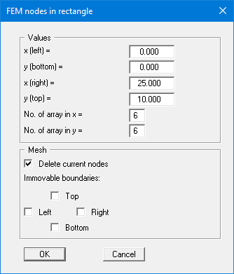 Enter the corner points of the array and the number of subdivisions. If the "Delete current nodes" check box is activated, all existing nodes are deleted and then the user-defined FEM nodes in the dialog box are generated with the appropriate FEM mesh. If you want to add further nodes, deactivate the check box.