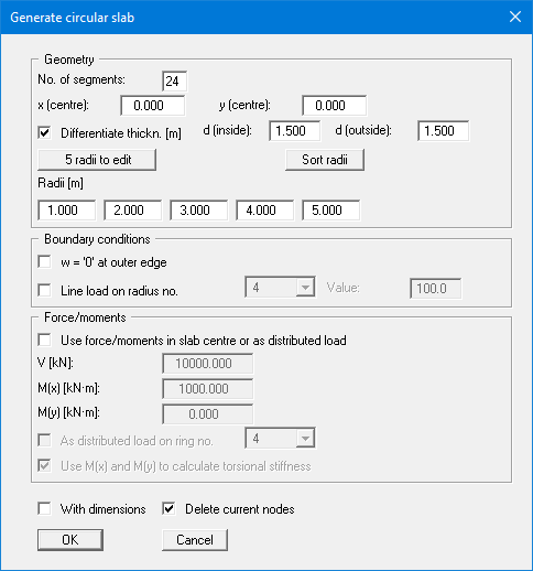 Any existing nodes and FEM mesh are automatically deleted. When you leave the dialog box the program recalculates the coordinates and displays the newly generated circular slab on the screen with the optimum coordinates."Circular slab (pro)"