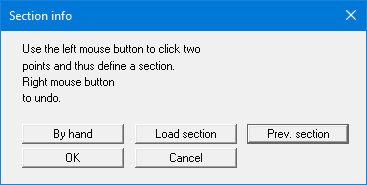 For this type of evaluation, the section course is no longer bound to the FEM nodes, but consists of a start and an end point. Using the "By hand" button you can specify the start and end points using numerical values instead of the mouse. If you have previously saved a section, it can be loaded again using "Load section". The "Prev. section" button is only visible if a section has already been defined and loads the section defined immediately prior.
