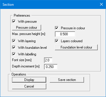 You can specify several preferences for displaying the stresses. After leaving the dialog box via the "Display" button the program first calculates the stresses and then displays the stress distribution at depth for the specified points. It is also possible to save the section from within the dialog box.