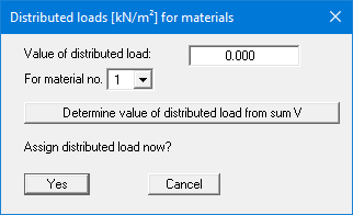 The size of the distributed load can be entered directly or determined by the program by pressing the "Determine value of distributed load from sum V" button. Sum V is then entered in an additional dialog box. The program calculates the distributed load using V/A and the area A determined for the selected material number.
