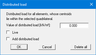When analysing with the new partial safety factors you will also see the "Live" check box because of the differentiation between permanent and changeable surcharges. If you activate the "Add distributed load" check box, the value entered will be added to any distributed loads already present. If negative entries are made the distributed load is reduced correspondingly. If you click the "Delete all" button, all existing distributed loads are deleted and you can define a new distributed load after specifying a new polygon.