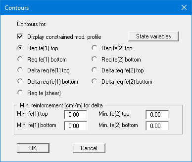 Using the four upper option buttons you select the required reinforcement at the upper and lower slab faces and fort he two reinforcement directions, 1 and 2. If the slab has a minimum reinforcement you can enter the minimum reinforcement fort he upper and lower slab faces (reinforcement directions 1 and 2) in "Min. reinforcement [cm²/m] for delta" and then have the further reinforcement requirement displayed using, for example, the "delta req fe(1) top" option button. If you press the "State variables" button the dialog box for selecting the state variables opens again (see above).