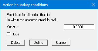 First select the type of action boundary condition. Then click four points in a counter-clockwise direction with the left mouse button. The right mouse button resets the selected points. The definition applies to all nodes in the quadrilateral. A dialog box appears in which you select the desired action.