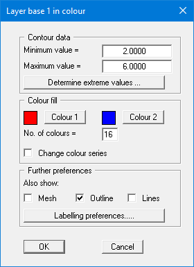 You can control the colour subdivisions of the contour diagram using "No. of colours". In the example above, 16 colours will be displayed between "Colour 1" and "Colour 2". The default setting is a colour course from red to blue. These colours can be edited as required after selecting the "Colour 1" and "Colour 2" buttons, or simply reverse the choice by selecting the "Change colour series" check box."Further preferences" group box