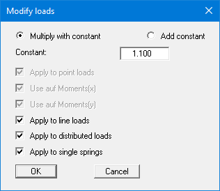 You can select whether the desired loads or single springs are to be multiplied by a constant or the constant is to be added. After confirming the settings with "OK", the number of changed loads or single springs is displayed in an info box.