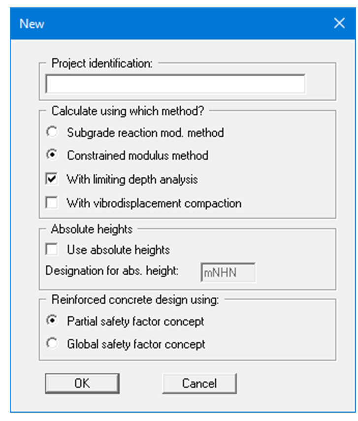 First, specify the analysis method in the dialog box. A limiting depth analysis can be made when using the constrained modulus method. The limiting depth analysis can also be activated in the dialog box in the menu item "System/Analyse". Further preferences for the analysis can be specified there.