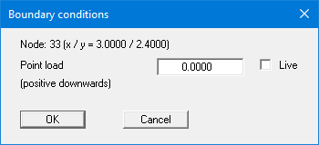 The point loads are defined within the FEM system in analogy to the displacement boundary conditions. The action boundary conditions can be defined as point load and moment M (x) and moment M (y). When analysing with the new partial safety factors you will also see the "Live" check box because of the differentiation between permanent and changeable surcharges.