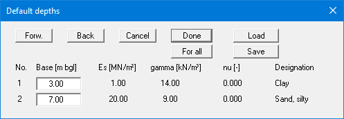 The depths entered here correspond to those specified at the beginning of this section.