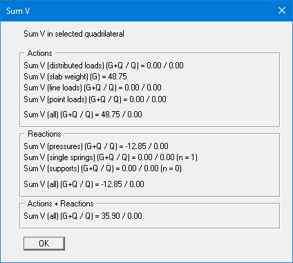 If supports, pressures or single springs are available, sum V can be determined for any areas. You must click on four points in an anti-clockwise direction. The results will then be displayed in a message box.