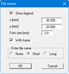 The legend can be displayed with a frame. The file name can be switched off ("None" option button) or be displayed automatically with or without the path by selecting the appropriate "Short" or "Long" option button. Any project identification entered in the "File/New" or "Edit/Project identification" dialog box will also be shown in this legend.