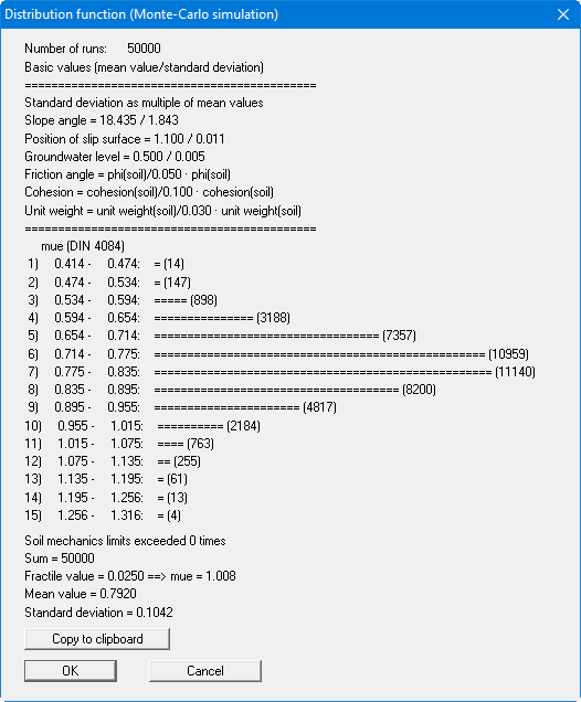 After confirming by pressing "OK" the program performs the specified number of calculations (50,000 computations in the box above). The parameters are randomly varied within the specified limits. The result is a distribution function for eta/mue, or for the tensile force for geogrid systems. In addition, a fractile value is determined, which can be defined in the above dialog box as a percentage value. For example, entering 0.025 (see above) means that 2.5% of the computed results are below the fractile value (see the following result box: eta = 1.205) and 97.5% of the computed results are above it.