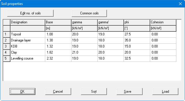 Using the "Common soils" button, you can easily select the soil properties of many common soils from a database or determine intermediate values. In the dialog box, which you open by pressing the "Common soils" button, open the "Soils_english.gng_ggu" file when first starting the program in English ("Edit table"/"Load" buttons). Then save the data set in the "Soils.gng_ggu" file on the program level in order to open your modified database file when the program starts. You can also enter your own data ("Edit table"/"x soils to edit" button) and save it in the "Soils.gng_ggu" file. You can also use your adapted file in other GGU programs by means of the "Common soils" function if you copy the file into the appropriate GGU program folder.