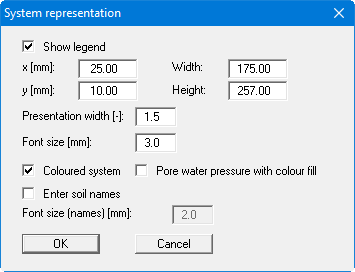 In multi-layer systems, the soils are labelled with the corresponding names if the "Enter soil names" check box is activated. A different font size can be used for the soil names than for the remaining labelling. For a wave pressure analysis it is possible to activate an additional "Force polygon with values" check box.