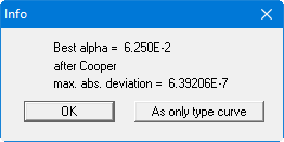 When the analysis is complete a window opens displaying the selected type curve parameter for your evaluation model. The maximum absolute deviation between the data curve and the type curve is calculated for this purpose. If you close the window with "OK", the type curve fit is drawn on the output sheet .